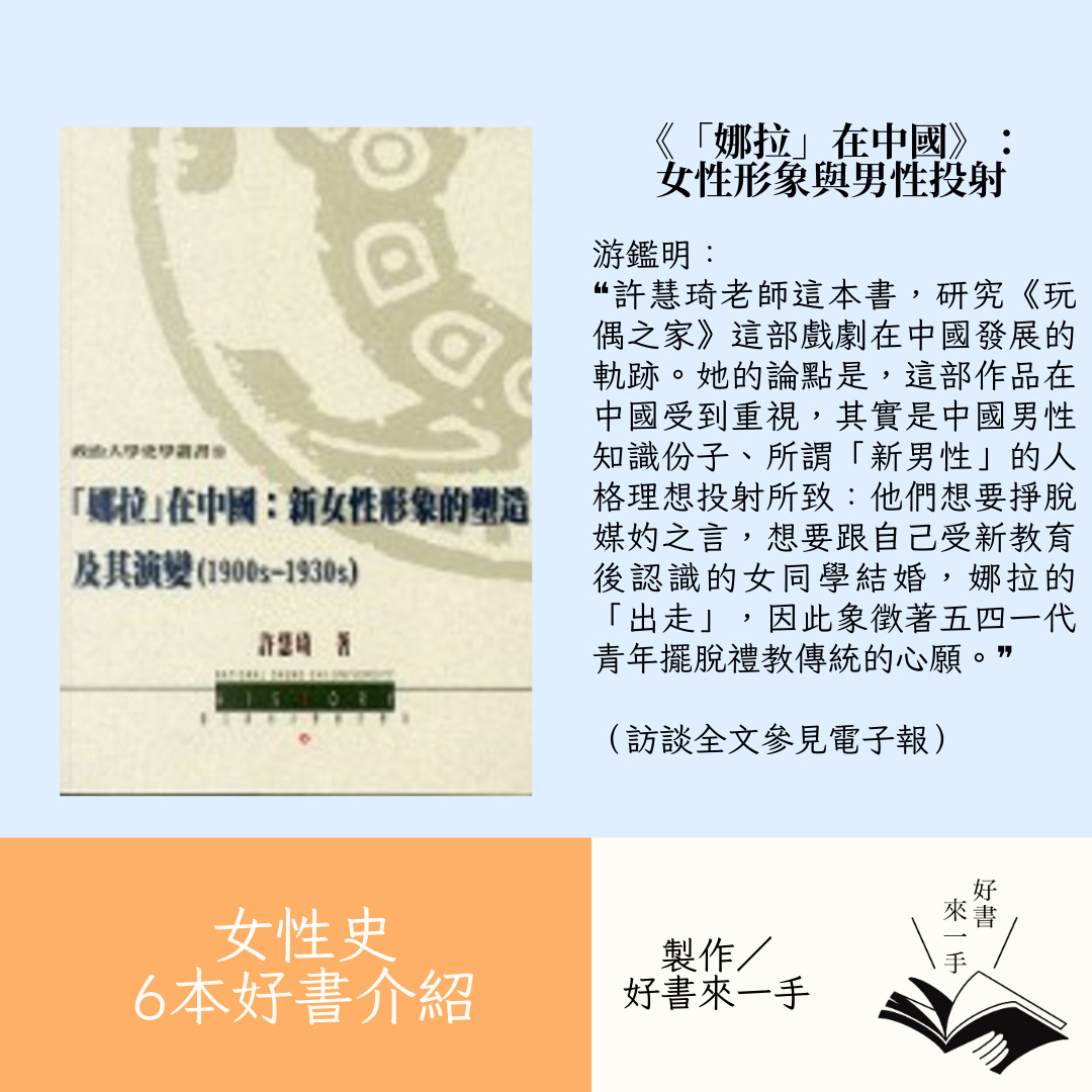 許慧琦老師這本書,研究《玩偶之家》這部戲劇在中國發展的軌跡。她的論點是,這部作品在中國受到重視,其實是中國男性知識份子、所謂「新男性」的人格理想投射所致:他們想要掙脫媒妁之言,想要跟自己受新教育後認識的女同學結婚,娜拉的「出走」,因此象徵著五四一代青年擺脫禮教傳統的心願。